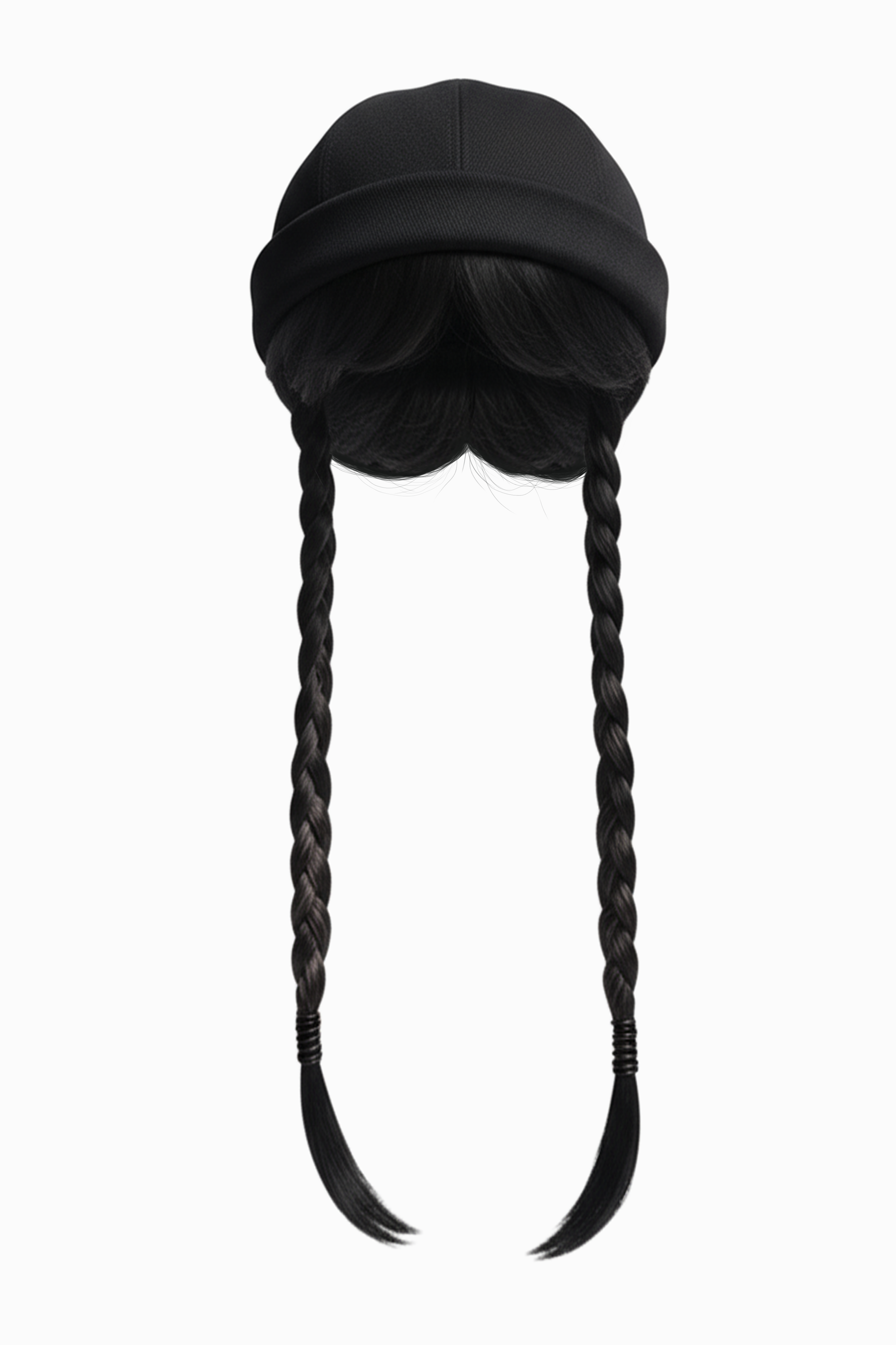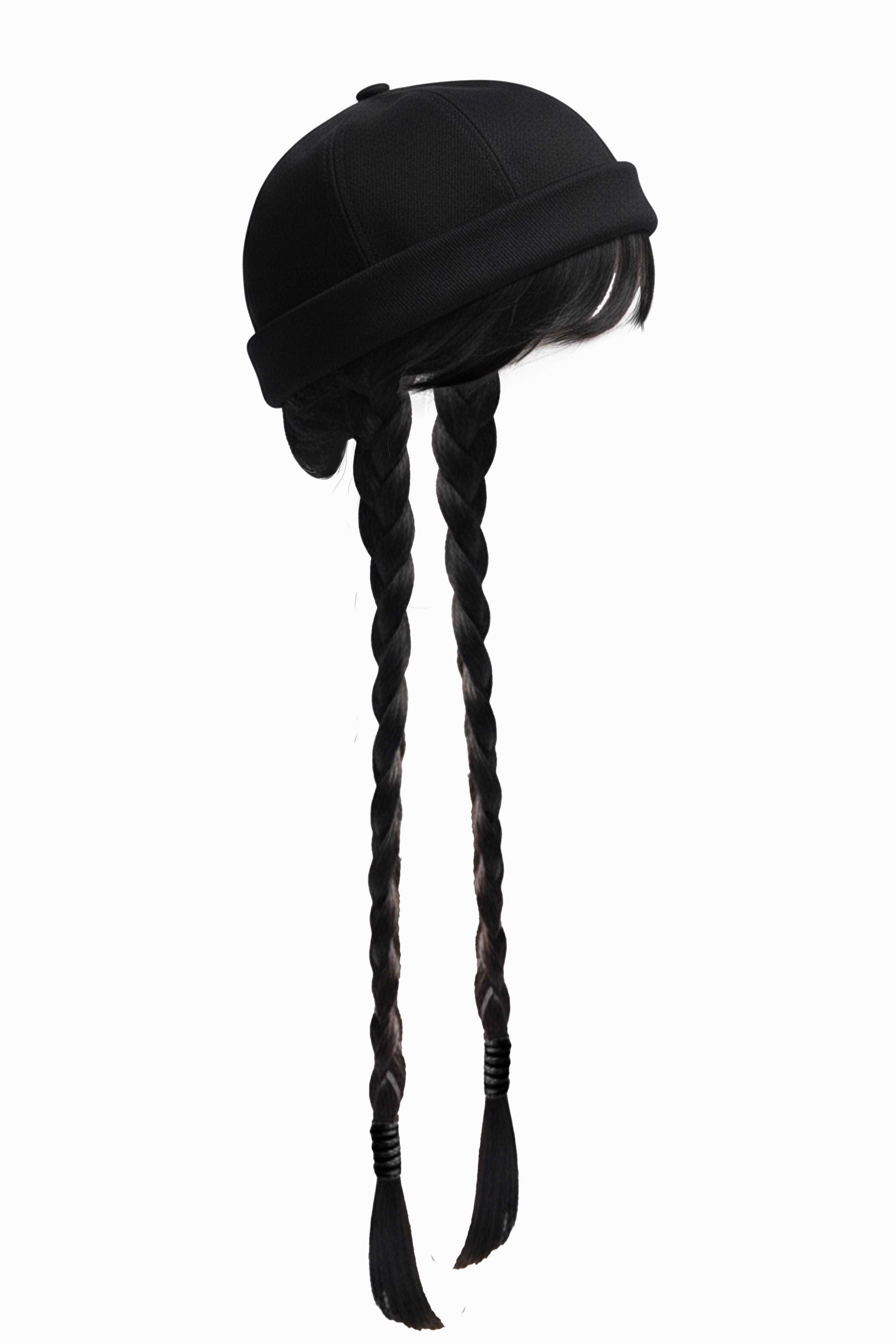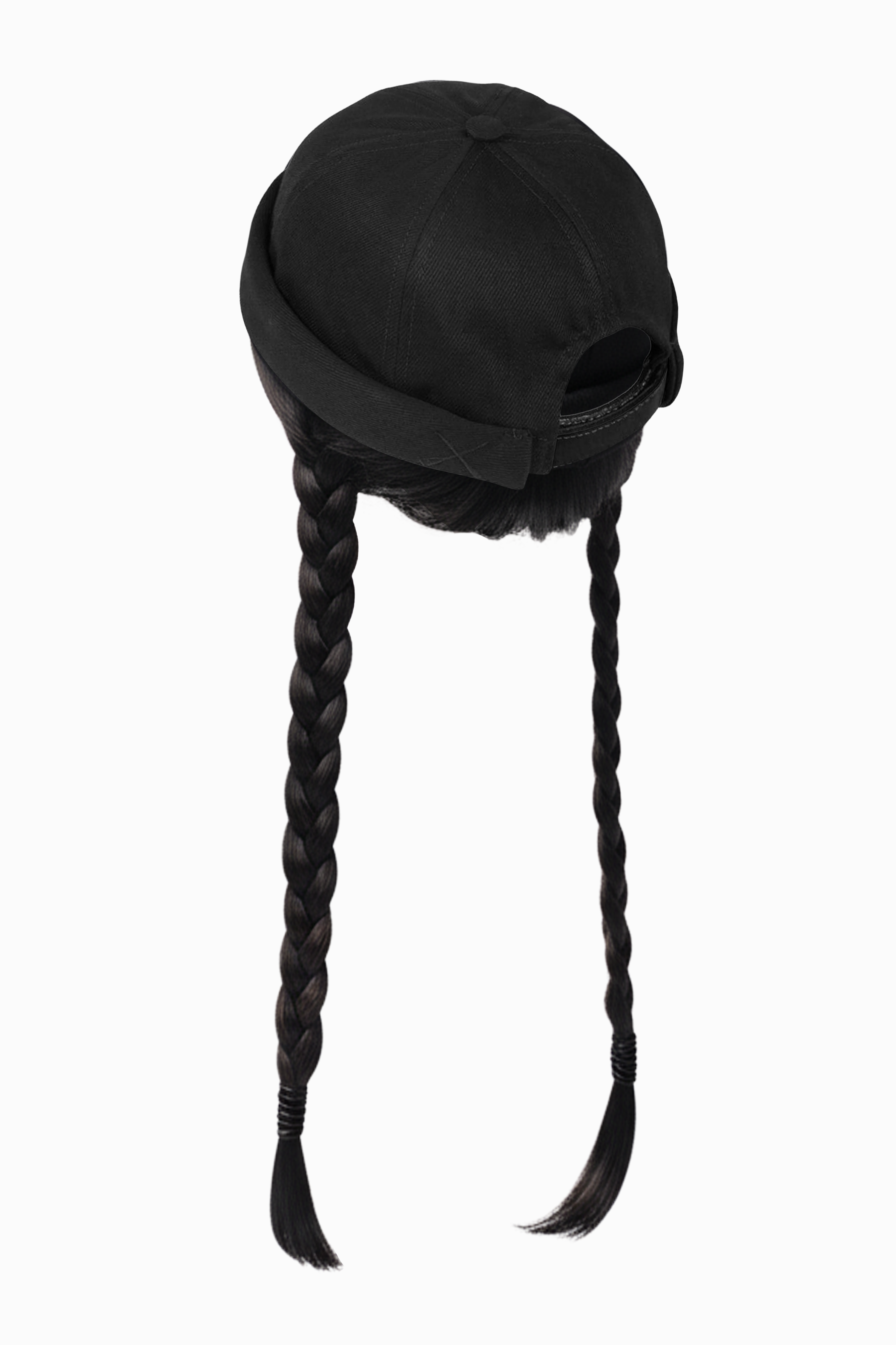 Made from deep black denim, this minimalist, structured beanie hides an irresistible detail: a full integrated hairstyle — blunt bangs and two long black braids — handcrafted from a blend of real and synthetic hair for an eerily realistic effect.