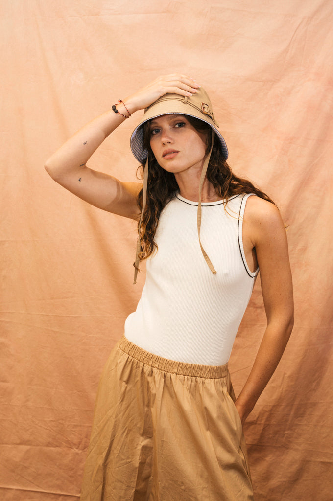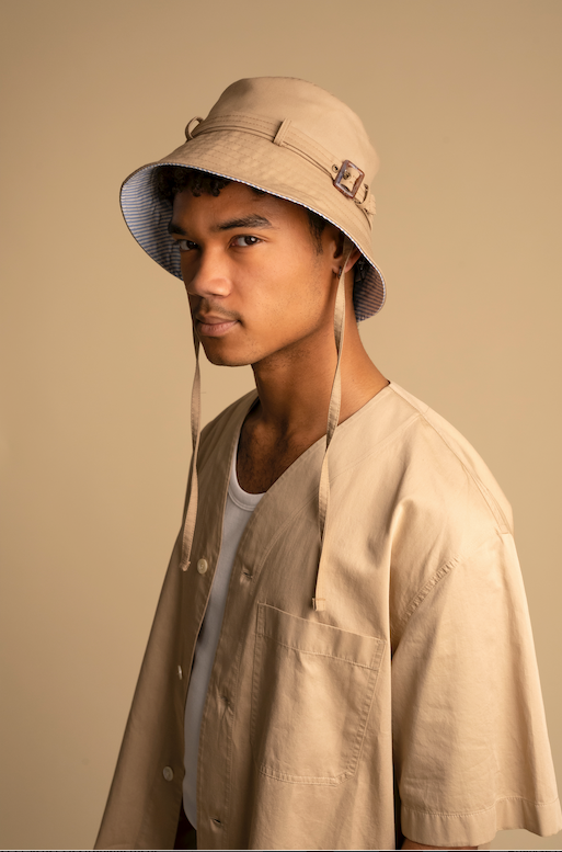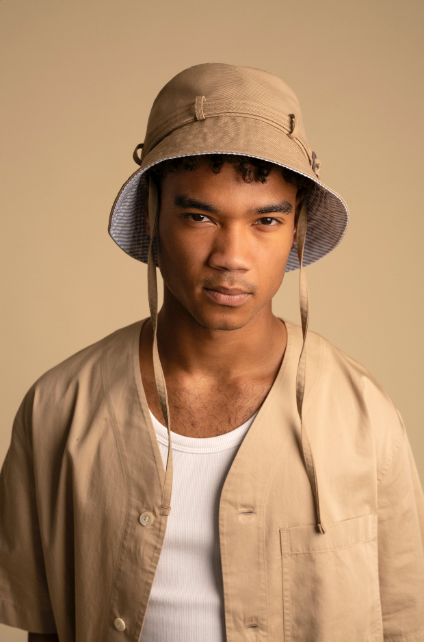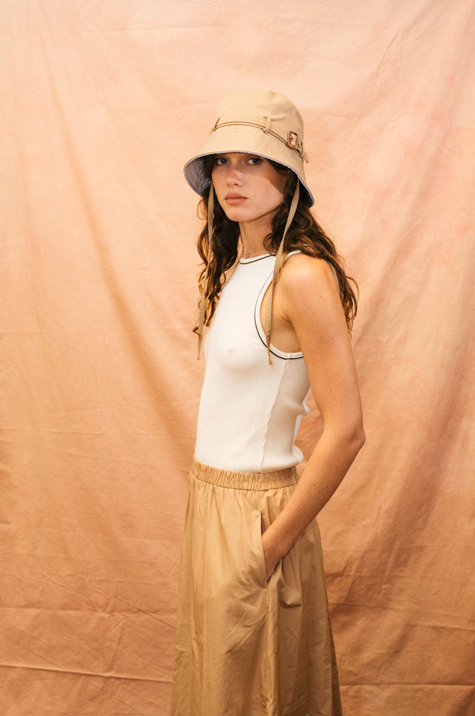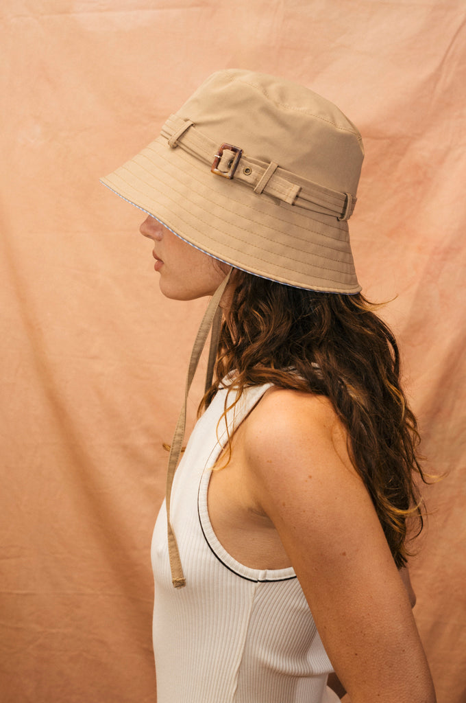 Conçu dans une douce teinte sésame, ce bob réinterprète subtilement les détails de la confection. Sous le bord, une fine rayure bleue et blanche reste discrète, se dévoilant uniquement lorsqu'on le relève. Une signature cachée, qui allie sobriété et caractère.